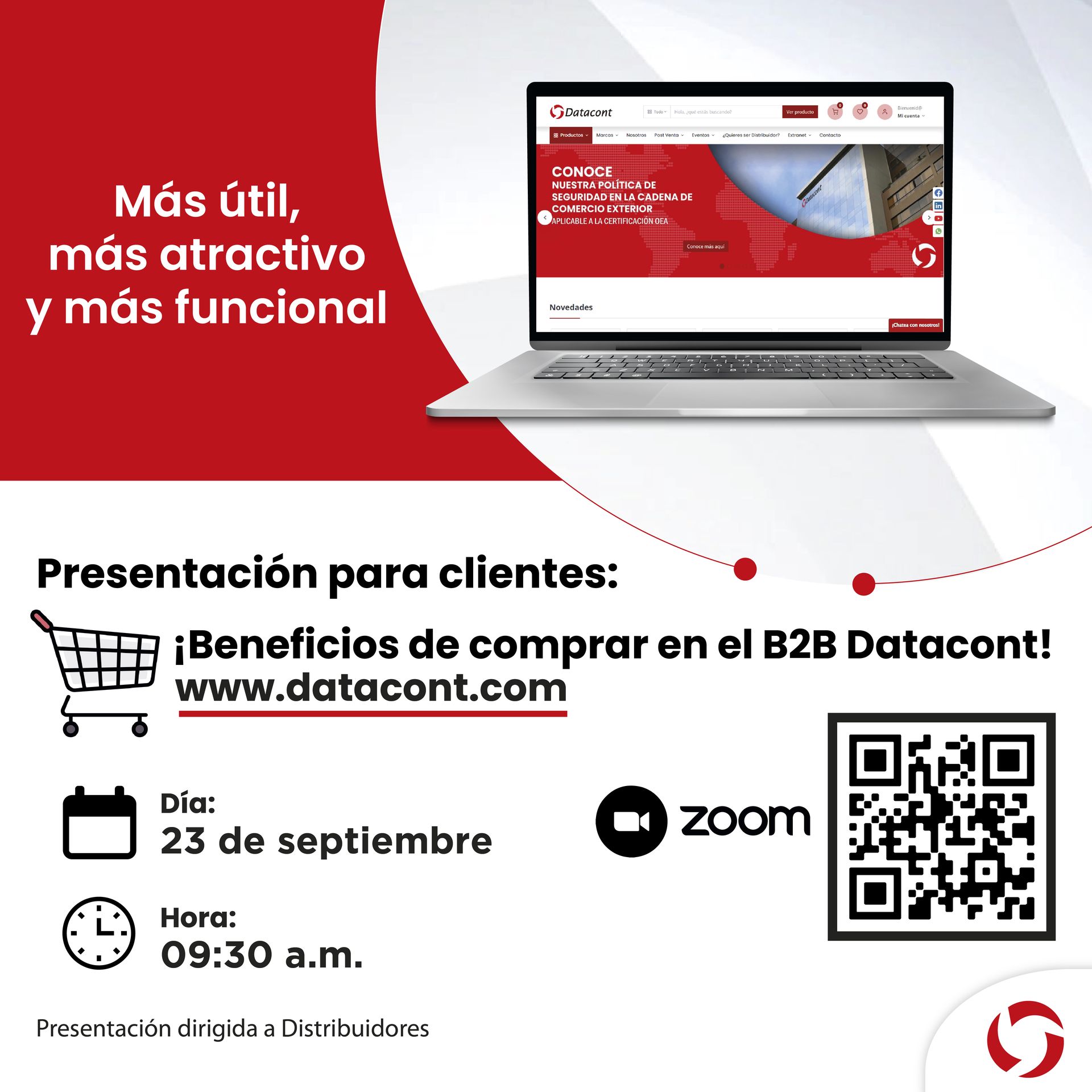 Tenemos el agrado de invitarlo a la presentación: ¡Beneficios de comprar en el B2B Datacont! 🌐🛒que se llevará a cabo este 23 de Septiembre a las 9:30 a.m. vía zoom.